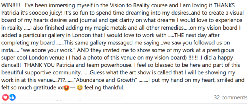 "The exact gallery I put on my vision board messaged me the next day inviting me to exhibit my art. The showâs name? Abundance and Growth!"